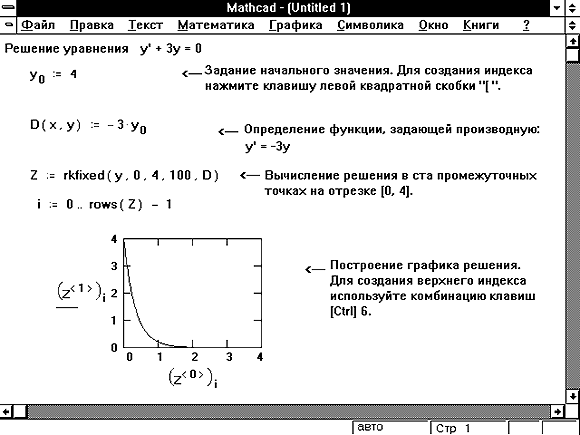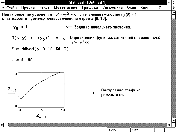 Наиболее трудная часть решения дифференциального уравнения состоит в определении функции D(x, y), которая содержит вектор первых производных от неизвестных функций. В примере, приведенном на Рисунке 1, было достаточно просто разрешить уравнение относительно первой производной , и определить функцию D(x, y). Иногда, особенно в случае нелинейных дифференциальных уравнений, это может быть трудно. В таких случаях иногда удаётся разрешить уравнение относительно в символьном виде и подставить это решение в определение для функции D(x, y). Используйте для этого команду Решить относительно переменной из меню Символика.