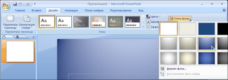 2)На выделенном слайде выполните заливку фона при помощи команды Дизайн, Стили фона.