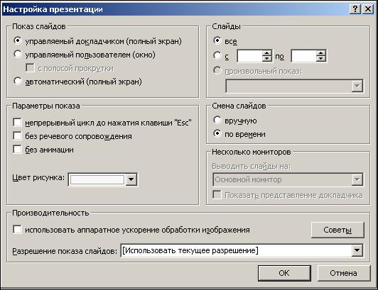 Переключатель и флажки раздела Показ слайдов (Show Type) открывшегося окна диалога (рис. 7) позволяют задать следующие режимы: