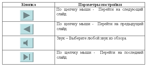 1. Кнопки. На каждом слайде будет размещено 4 кнопки: переход к следующему слайду, переход к предыдущему слайду, выход из презентации, звуковое сопровождение.