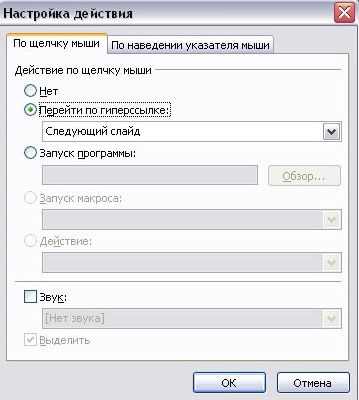 Начнем со второго слайда. В главном меню Показ слайдов – Управляющие кнопки.Выбираем нужную кнопку. В окне Настройка действия – По щелчку мыши – Перейти по гиперссылке выбираем: следующий слайд, предыдущий слайд и т.д. Изменим размеры кнопок с помощью мыши. Теперь нам все эти кнопки необходимо добавить на следующие слайды. Сделать это будет непросто, т.к. подогнать размеры кнопок точно, мы не сможем. Поступим проще. Скопируем первую кнопку и вставим ее последовательно в следующие слайды. Причем, обратите внимание, она встанет в нужное место, туда, где она была размещена на 2 слайде. Аналогично поступите с остальными кнопками.