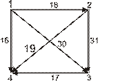 Пример 2.1.1. Для четырех городов даны времена полета из одного города в другой. Найти наилучший маршрут для поездки по этим четырем городам. Число на пересечении