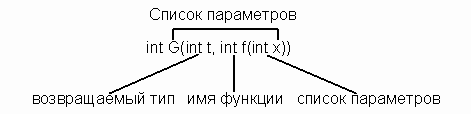 Чтобы определить аргумент некоторой функции как указатель на функцию, необходимо в описание параметра поместить описание передаваемой функции. Пусть, например, функция G имеет параметр — функцию f. В этом параметре указывается имя функции (f), список параметров (int x) и возвращаемый тип (int).