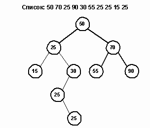Например, следующее дерево генерируется из списка 50 70 25 90 30 55 25 15 25.