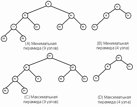 Представляемые массивами деревья находят применение в имеющих большое значение приложениях с пирамидами (heaps), являющимися законченными бинарными деревьями, имеющими упорядочение узлов по уровням. В максимальной пирамиде (maximum heap) родительский узел больше или равен каждому из своих сыновей. В минимальной пирамиде (minimum heap) родительский узел меньше или равен каждому из своих сыновей. Эти ситуации изображены на рис. 15. В максимальной пирамиде корень содержит наибольший элемент, а в минимальной — наименьший.