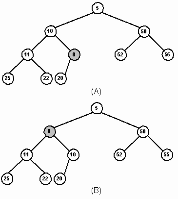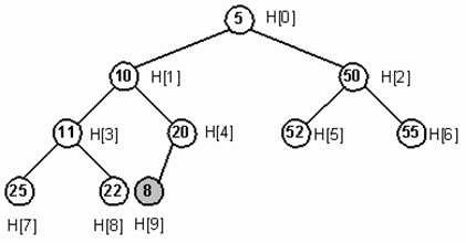 Отправить значение 8 на вышестоящий уровень пирамиды (по пути предков J ). Сравнить 8 с родителем 20. Поскольку сын меньше своего родителя, поменять их значения местами (см. ниже рис. A). Продолжить движение вверх. Теперь элемент 8 меньше своего родителя H[1]=10 и поэтому меняется с ним местами. Процесс завершается, так как следующий родитель удовлетворяет условию пирамидальности.