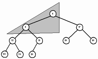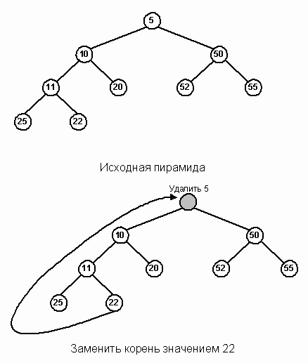 Данные удаляются всегда из корня дерева. После такого удаления корень остается ничем не занятым и сначала заполняется последним элементом пирамиды. Однако такая замена может нарушить условие пирамидальности. Поэтому требуется пробежать по всем меньшим потомкам и найти подходящее место для только что помещенного в корень элемента. Если он больше любого своего сына, мы должны поменять местами этот элемент с его наименьшим сыном. Движение по пути меньших сыновей продолжается до тех пор, пока элемент не займет правильную позицию в качестве родителя или пока не будет достигнут конец списка. В последнем случае элемент помещается в листовой узел. Например, в нижеприведенной пирамиде удаляется корневой узел 5.
