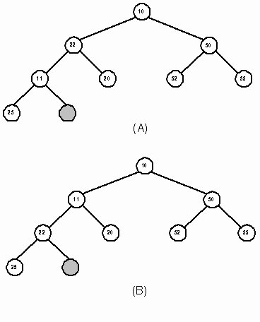 Передвигать число 22 от корня вниз по пути, проходящему через меньших сыновей. Сравнить корень 22 с его сыновьями. Наименьший из двух, сын H[1], меньше, чем 22, поэтому следует поменять их местами (cм. ниже рис. A). Находясь на первом уровне, новый родитель сравнивается со своими сыновьями H[3] и H[4]. Наименьший из них имеет значение 11 и поэтому должен поменяться местами со своим родителем (cм. ниже рис. В). Теперь дерево удовлетворяет условию пирамидальности.