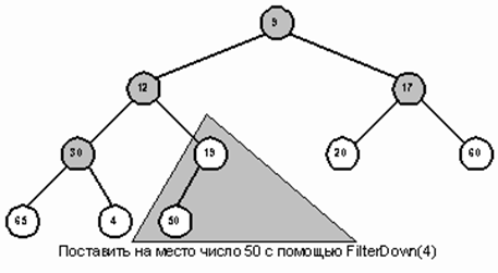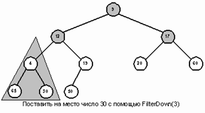 Метод Delete. Чтобы поместить узел в правильную позицию, операция удаления использует метод FilterDown. Эта функция получает в качестве параметра индекс i, с которого начинается сканирование. В данном случае метод FilterDown вызывается с параметром 0, так как замещающее значение копируется из последнего элемента пирамиды в ее корень. Метод FilterDown используется также конструктором для построения пирамиды.