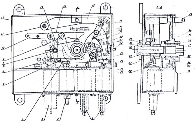 Электромагнит отключения; 4, 16, 19, 23, 27 – пружины; 3-реле РС; 5 – регулировочный винт; 6-механизм взвода реле РС; 7, 20, 33 – оси; 8 – гайка М10; 10, 14, 28, 37 – рычаги; 9 – тяга; 11 – ось; 12 корпус; 13 – собачка; 15 – серповидный рычаг; 17 – механизм расцепления; 18 – винт М6; 21 – защелка; 22 – болт М8; 24 – планка; 25 – винт М4; 26 – релейная планка; 29 подшипник; 30 – вал; 31 – шпонка; 32 – шайба; 34 – кольцо; 35 – передняя стенка; 36 – игольчатые ролики; 38 – шайба; 39 – болт М12; 40 – шайба; 41 – кожух.