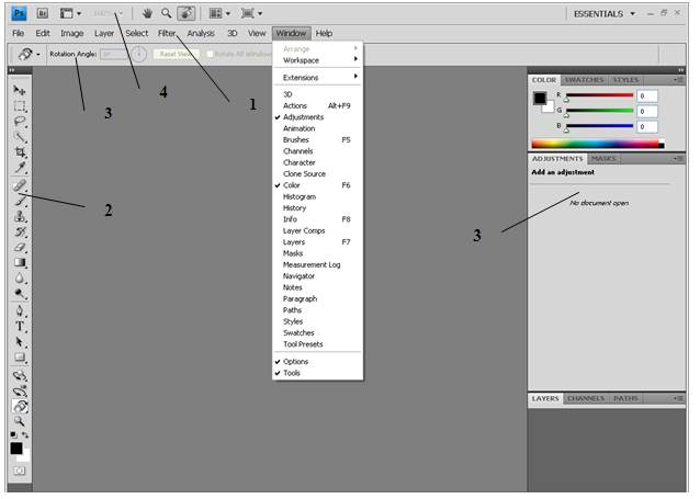 В верхней строке (4) размещаются главное командное меню программы, новый инструмент для быстрого доступа к приложениям Adobe ‑ Application bar. С его помощью пользователь получает мгновенный доступ к программе Adobe Bridge, линейкам и инструментам масштабирования и перемещения Hand (Рука) и Zoom (Увеличение), функциям упорядочивания документов (Arrange Documents). На этой панели выделен также новый инструмент Canvas Rotation (Поворот холста).