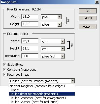 Бикубическая, четче (Bicubic Sharper (best for reduction))- хороший метод для уменьшения размера изображения на основе бикубической интерполяции с повышенной резкостью. Этот метод позволяет сохранить детали изображения, подвергнутого ресамплингу. Если интерполяция "Бикубическая, четче" делает слишком резкими некоторые области изображения, попробуйте воспользоваться бикубической интерполяцией.
