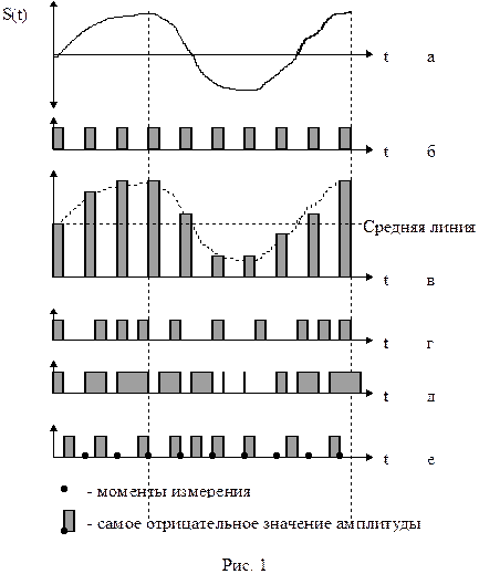 На рис.1 представлены временные диаграммы первичного аналогового сигнала (а), тактовая последовательность моментов времени (отсчетов) в виде синхронизирующих импульсов, вырабатываемых тактовым генератором -ТГ (б), и модулированные сигналы с использованием АИМ (в), ЧИМ (г), ШИМ (д) и ФИМ (е).