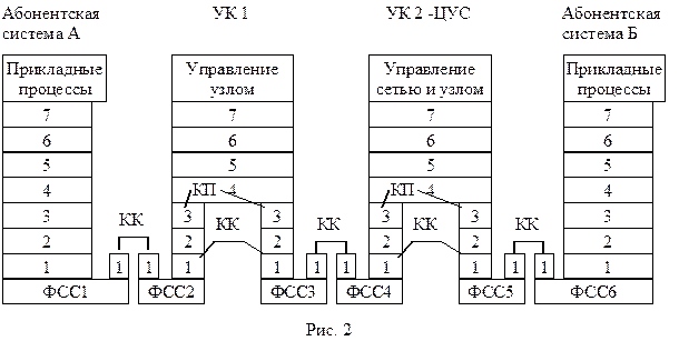 Здесь передача пакетов абонентскими системами происходит через тракт, образуемый последовательностью физических средств соединения (ФСС). При выполнении процессов коммутации каналов (КК) последние связывают вместе физические уровни узлов коммутации: ФСС1 и ФСС2, ФСС2 и ФСС3, ФСС3 и ФСС4, ФСС4 и ФСС5, ФСС5 и ФСС6.