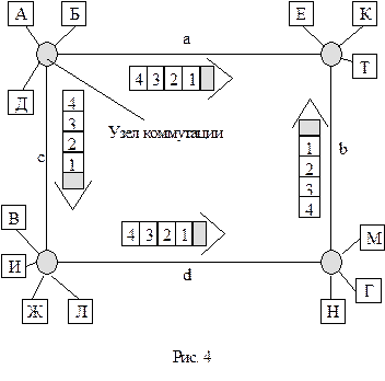Рассмотрим пример. В сети имеется четыре магистральных канала a, b, c, d связываюшие четыре узла коммутации (коммутатора, маршрутизатора). В этих каналах время разделено на циклы, каждый из которых содержит по четыре временных интервала по одному для каждого магистрального канала (см. рис. 4).