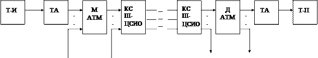 Терминал - источник (Т-И) генерирует цифровой сигнал. Терминальный адаптер (ТА) выполняет роль индивидуального формирователя пакетов ATM, реализуя функции генерации заголовков, и затем передает пакеты ближайшему асинхронному мультиплексору МATM, который формирует групповой кадр. В некоторых случаях неформатированный цифровой поток от источника поступает в МATM, выполняющий роль группового формирователя пакетов.