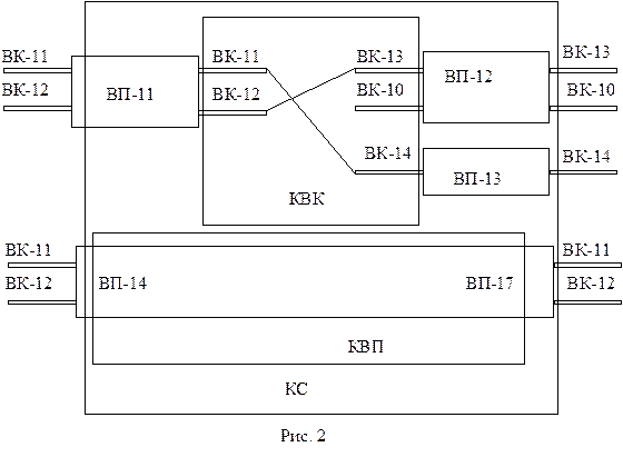 На рис. 2 условна изображена функциональная структура коммутационной системы (КС) с КВК и КВП. КС состоит из двух частей: коммутатора ВК и коммутатора ВП, где осуществляются соответственно коммутация ВК и коммутация ВП. Например,