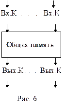 КС с общей памятью. Входные и выходные контроллеры КС соединены между собой не через шину, а через общую память (рис. 6), запись в которую производится всеми входными контроллерами, а считывание — всеми выходными контроллерами. В памяти можно реализовать как входные, так и выходные БЗУ, использование выходных БЗУ является более предпочтительным. К недостаткам КС этого типа можно отнести ее высокие сложность и стоимость.
