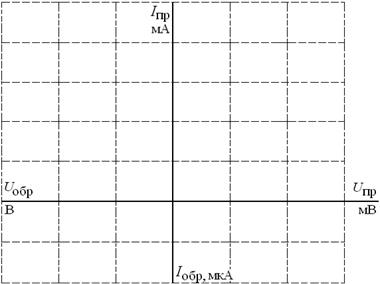 Задание 5.Определить подробно начальную часть ВАХ диода с помощью осциллографа, цена деления по U: 200 мВ; по I: 100 мА (L5_d_04.ewb). Используя данные таблиц 2, 3, дорисовать ВАХ для больших значений U, I. Масштаб величин прямой и обратной ветвей выбрать разным.