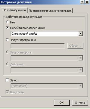 В диалоговом окне «Настройка действия» на вкладке «По щелчку мыше» (см. рис. 3) выберите действие Перейти по гиперссылке – Следующий слайд.Щелкните кнопкеОК.
