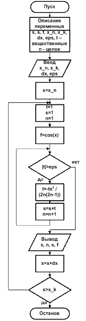 1. Составить алгоритм и написать код программы, вычисляющей значения суммы ряда S при заданных с консоли начальном и конечном значениях аргумента x(x_nach, x_kon), шаге его изменения delta_x и точности вычислений eps. Вычисленные значения ряда сравнить со значениями функции f=cos(x). Результаты вычислений вывести в виде таблицы с заголовком.
