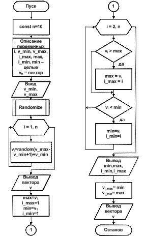 Поиск максимального элемента вектора осуществляется следующим образом. Перед началом поиска за максимальный элемент вектора max принимается его первый элемент: max=vector1. Далее каждый следующий элемент вектора vectori, начиная со второго, сравнивается с максимальным элементом: если он больше максимального, то сейчас он – максимальный элемент вектора: max=vectori. Поиск минимального элемента осуществляется аналогично. В процессе поиска индексы максимального и минимального элементов (i_max, i_min) запоминаются.