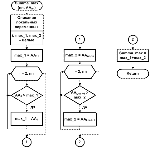 Перед началом поиска максимального элемента max_2 побочной диагонали массива принимаем за него элемент massivnn. После этого сравниваем остальные элементы побочной диагонали massivij (i=2,…,n; j=n-i+1) с текущим максимумом: если очередной элемент больше текущего максимума max_2, то сейчас он – текущий максимум.