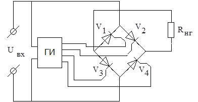 Управление тиристорами осуществляется попарно ( , ,и , ) от специального генератора импульсов (ГИ), синхронизированного по частоте с входным напряжением.