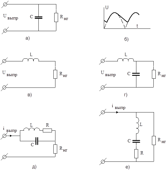 На рис.6 приведены схемы наиболее распространенных фильтров. Схемы рис.6 а, в, г используются, еслисхема выпрямителя питается от источника напряжения, схемы рис.6 д, е - от источника тока.