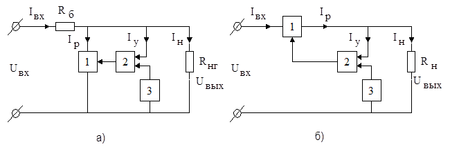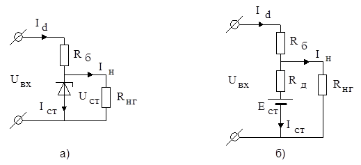 В стабилизаторах параметрического типа стабилитрон применяется в сочетании с балластным сопротивлением R Б , включенным последовательно в цепь питания (рис.7). Через это сопротивление проходит нагрузочный ток IН и ток стабилитрона I СТ .
