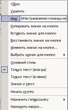 4. Отбуксировать мышь так, чтобы горизонтальная линия располагалась за командой МАКРОСи отпустите кнопку. В меню появиться окруженная рамкой команда Настраиваемая команда меню. Щелчок пр.м.на команде, откроется контекстное меню.(Рис.)