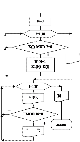 1) Найти четные элементы в одномерном массиве К(30). Организовать из найденных элементов отдельный массив (представлен фрагмент блок-схемы)