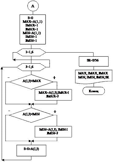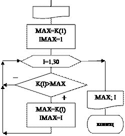 2) Найти максимальный элемент в одномерном массиве К(30) и его порядковый номер (представлен фрагмент блок-схемы)