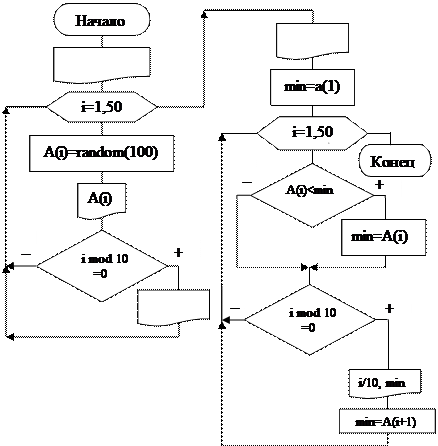 4) В массиве А(50) найти минимальный элемент в каждом десятке элементов. Заданный массив распечатать.