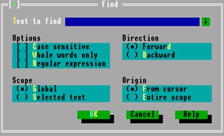 FIND. Обеспечивает поиск нужного фрагмента текста в активном окне редактора. В момент обращения к этой опции в поле выбора диалогового окна (рис. 2.5) содержится слово, на которое указывал курсор в активном окне редактора. Вы можете ввести новое слово или текстовую строку, положение которой в редактируемом файле необходимо найти, или выбрать эту строку из протокола. После нажатия на «Enter» (или выбора командного поля «ОК») редактор отыщет этот фрагмент в тексте и установит курсор на его начало.