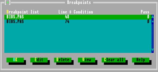 BREAKPOINTS. Эта опция позволяет просмотреть все контрольные точки и при необходимости удалить, переместить любую контрольную точку или задать условия ее работы. В диалоговом окне опции (рис. 2.6) приводится список всех контрольных точек с указанием имени файла (колонка Breakpoints list), номера строки в этом файле (колонка Line #), с которой связана контрольная точка, условия, при котором срабатывает останов программы в этой точке (колонка Condition), и количества проходов (колонка Pass), в течение которых останов не происходит. Цветным указателем выделяется текущая контрольная точка.