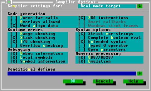 Опция Emulation указывает компилятору, надо ли создавать такой код программы, который будет одинаково пригоден при работе на ПК с арифметическим сопроцессором или без него. Программа сама определит наличие сопроцессора и, если он имеется, будет использовать все его возможности; если же сопроцессора нет, его работа будет эмулироваться программно. В этом случае программе становятся доступны все вещественные типы. Активное состояние этой опции увеличивает размеры программы за счет подключения процедур эмуляции, но делает ее независящей от аппаратных особенностей ПК. Опция Emulation игнорируется, если неактивна опция 8087/80287.