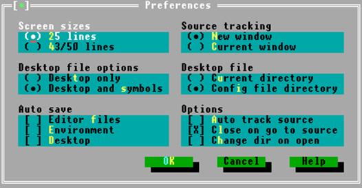 Опция Environment задает режим автоматического сохранения текущей настройки среды Турбо Паскаля в файле конфигурации TURBO.TP. Настройка среды будет сохранена автоматически при временном или окончательном выходе из Турбо Паскаля, если она изменилась с момента последней записи в этот файл. Активное состояние опции Desktop требует от среды автоматически сохранять на диске в файле TURBO.DSK информацию об открытых окнах, их размерах, контрольных точках и т.п.