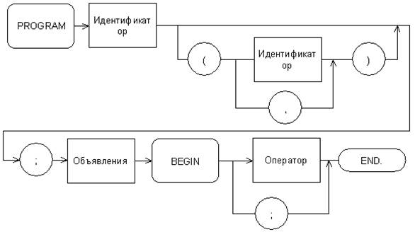 Как видно из синтаксической диаграммы (рис. 6), любая Паскаль-программа имеет имя, за которым может следовать список идентификаторов, заключенных в скобки. Заголовок программы заканчивается точкой с запятой. Затем идут объявления, служащие для описания типов данных, процедур и функций. Далее BEGIN, один или несколько операторов, разделенных точками с запятой, и в конце ставится END с точкой. При написании программ используются лексемы и разделители, определенные алфавитом языка.