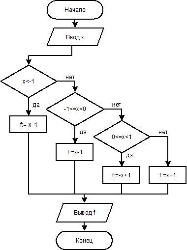 Program example1; var x, f:Real; begin Write('Введите x: '); Readln(x); if x<-1 then f:= -x-1 else if (x>=-1) and (x<0) then f:= x-1 else if (x>=0) and (x<1) then f:= -x+1 else f:= x+1; Writeln('F= ',f:6:2); Readln; end.