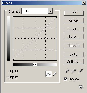 На графике вдоль горизонтальной оси расположены исходные значения яркостей пикселей (Input — Вход), а по вертикальной оси — новые откорректированные значения (Output — Выход). Пока не внесено никаких изменений, исходные значения яркостей пикселей (входные) и новые (выходные) одинаковы, поэтому кривая представляет собой прямую линию, расположенную под углом 45 градусов. Эта линия означает отсутствие коррекции. Нижняя левая точка прямой — тени, центральная часть — средние тона, а верхняя правая точка — свет.