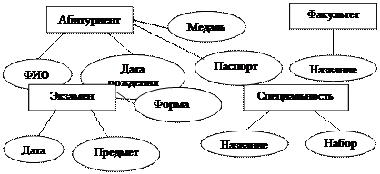 Выделим классы объектов – Абитуриент, Факультет, Специальность, Экзамен – и определим свойства этих классов.