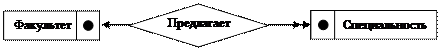 2. Каждый факультет предлагает одну или несколько специальностей, разные факультеты не могут предлагать одинаковые специальности. Эта связь имеет тип «один-ко-многим». Не может быть специальности, не принадлежащей ни к одному факультету, так же как факультета без хотя бы одной специальности. Поэтому связь является обязательной по отношению к обоим классам.