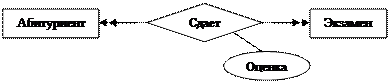 4. Абитуриент сдает несколько экзаменов. Каждый экзамен сдают несколько абитуриентов. Связь имеет тип «многие-ко-многим». Абитуриент может не сдавать ни одного экзамена (зачислен без сдачи экзаменов). Экзамен может не сдавать ни один абитуриент (все уже зачислены по итогам предыдущих экзаменов). Поэтому связь является необязательной по отношению к обоим классам. При сдаче экзамена абитуриент получает оценку. Оценка будет свойством связи.
