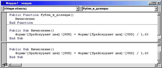 Отобразить на экране две процедуры (два фрагмента кода) одновременно позволяет команда Разделитьиз меню Окно.В результате активизации этой команды окно модуля делится на две части (панели), в каждой из которых могут отображаться разные фрагменты. Для восстановления исходного состояния окна надлежит повторно вызвать указанную команду.