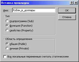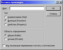 панели инструментов Visual Basic.В результате ее активизации открывается диалоговое окно Вставка процедуры,которое служит для выбора типа процедуры (подпрограмма (Sub) или функция (Function))и присвоения ей имени