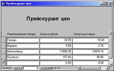 Forms! [Прейскурант цен]! [Цена в долларах]= Forms! [Прейскурант цен]! [Цена в рублях]/5.5