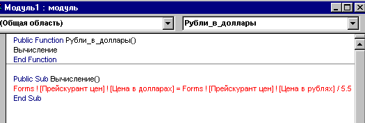 Далее необходимо через буфер обмена скопировать операторы из функции Рубли_в_Доллары в создаваемую подпрограмму. Для этой цели сконфигурируйте окно модуля таким образом, чтобы на экране одновременно отображались обе процедуры.