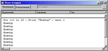 В панели выполнения, занимающей нижнюю часть окна отладки, можно в любой момент просмотреть и изменить значения переменных, а также запустить процедуры для отладки или выполнить различные операторы. Существует возможность управления данной панелью из программы: в нее можно помещать промежуточные результаты (отладочную информацию) После выполнения программы эта информация останется в панели.
