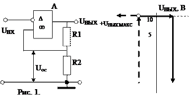 На рис.2 представлена передаточная характеристика инвертирующего компаратора, которая имеет прямоугольную форму гистерезиса. Чувствительность компаратора равна напряжению обратной связи Uос, а разрешающая способность напряжению гистерезиса Uгист=2 Uос. Для того, чтобы перевести состояние компаратора в противоположное, необходимо изменить входное напряжение до величины напряжения обратной связи. При Uвх=Uос происходит срабатывание компаратора.